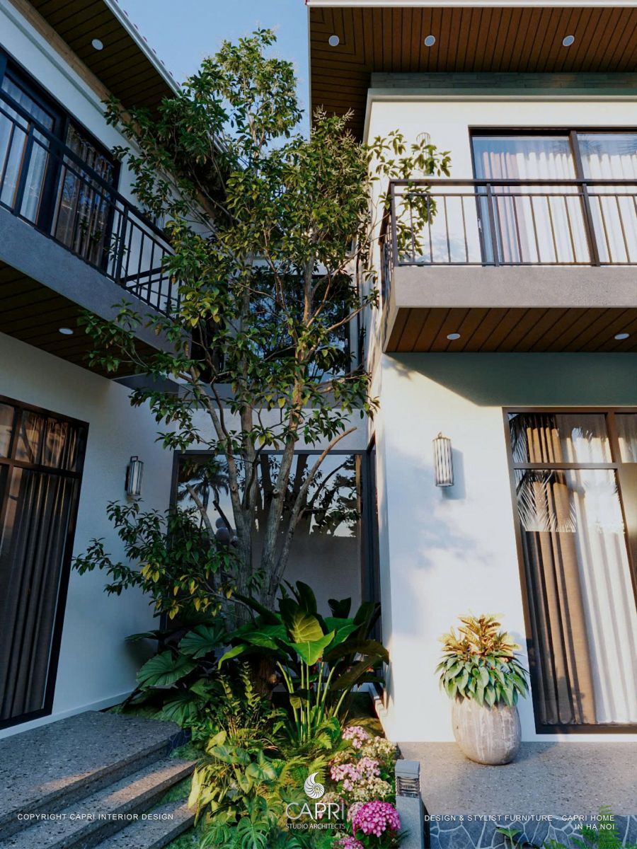 Khu vực sân vườn tại Sen Trì Retreat được ví như một lá phổi xanh, nơi thiên nhiên được mời gọi hòa làm một với kiến trúc. Không đơn thuần là những thảm cỏ hay lối đi, không gian này được thiết kế như một khu rừng thu nhỏ đa tầng, với sự kết hợp của cây thân gỗ lớn tán rộng, các bụi cây tầng trung và thảm thực vật phủ nền. Sự sắp xếp này không chỉ tạo ra những mảng xanh vi diệu, mang lại bầu không khí trong lành, mà còn kiến tạo những góc nhìn đa dạng và sống động từ bên trong ngôi nhà. Mỗi bước chân trong khu vườn đều là một trải nghiệm trị liệu giác quan, nơi tiếng xào xạc của lá, hương thơm của cỏ cây và ánh sáng lọc qua tán lá cùng hòa quyện, xóa tan mọi dấu vết của nhịp sống đô thị hối hả bên ngoài.