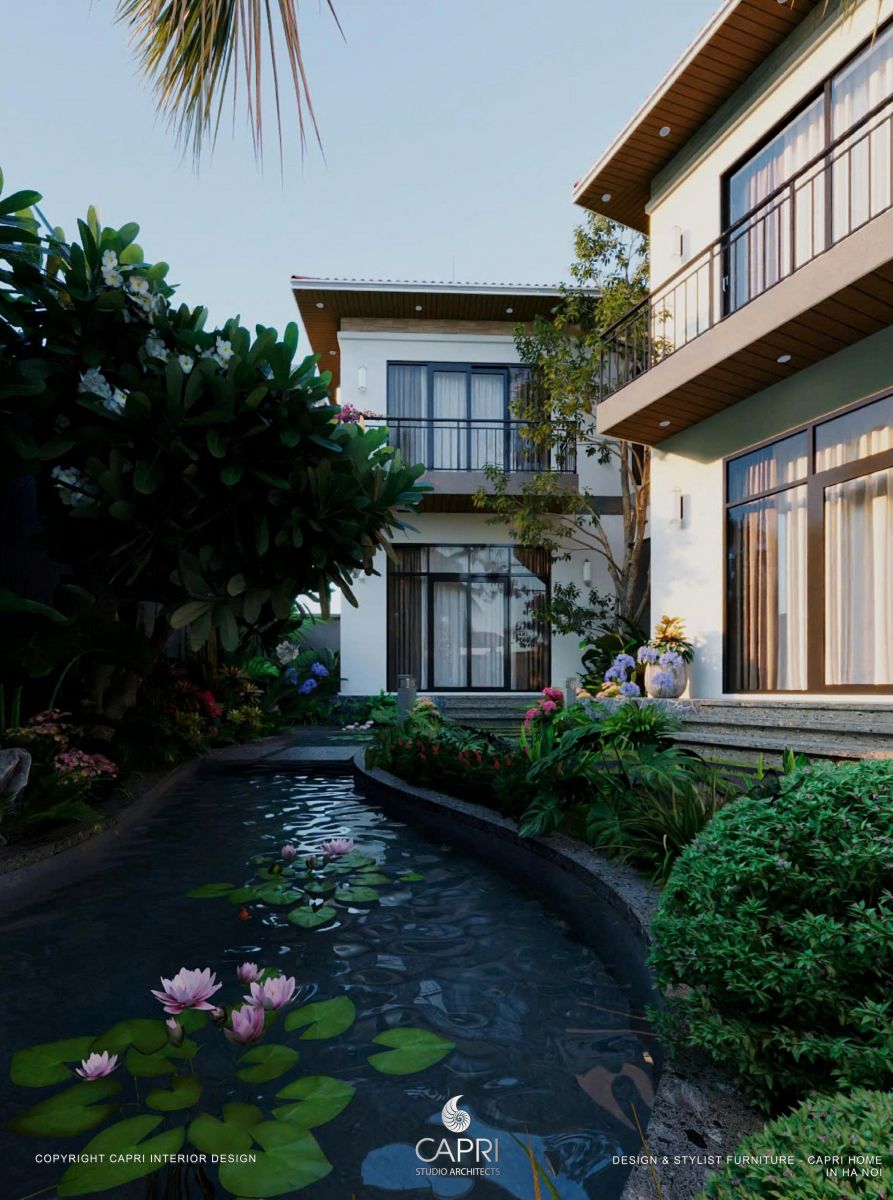 Không gian mở của Sen Trì Retreat được tổ chức một cách thông minh, nơi ranh giới giữa bên trong và bên ngoài trở nên mờ nhòa. Hệ thống cửa kính rộng từ sàn đến trần không chỉ đón ánh sáng tự nhiên tràn ngập mà còn kết nối trực tiếp không gian sinh hoạt chính với khu vườn xanh mát. Phong cách thiết kế nội thất từ CapriHome thể hiện rõ triết lý "less is more" - những đường nét tối giản, chất liệu tự nhiên như gỗ, đá được sử dụng làm chủ đạo, tạo cảm giác ấm cúng và thanh bình. Cảnh quan được thiết kế như một phần mở rộng của nội thất, biến khu vườn thành một "phòng khách xanh" giúp gia chủ thư giãn và tái kết nối với tự nhiên mỗi ngày.