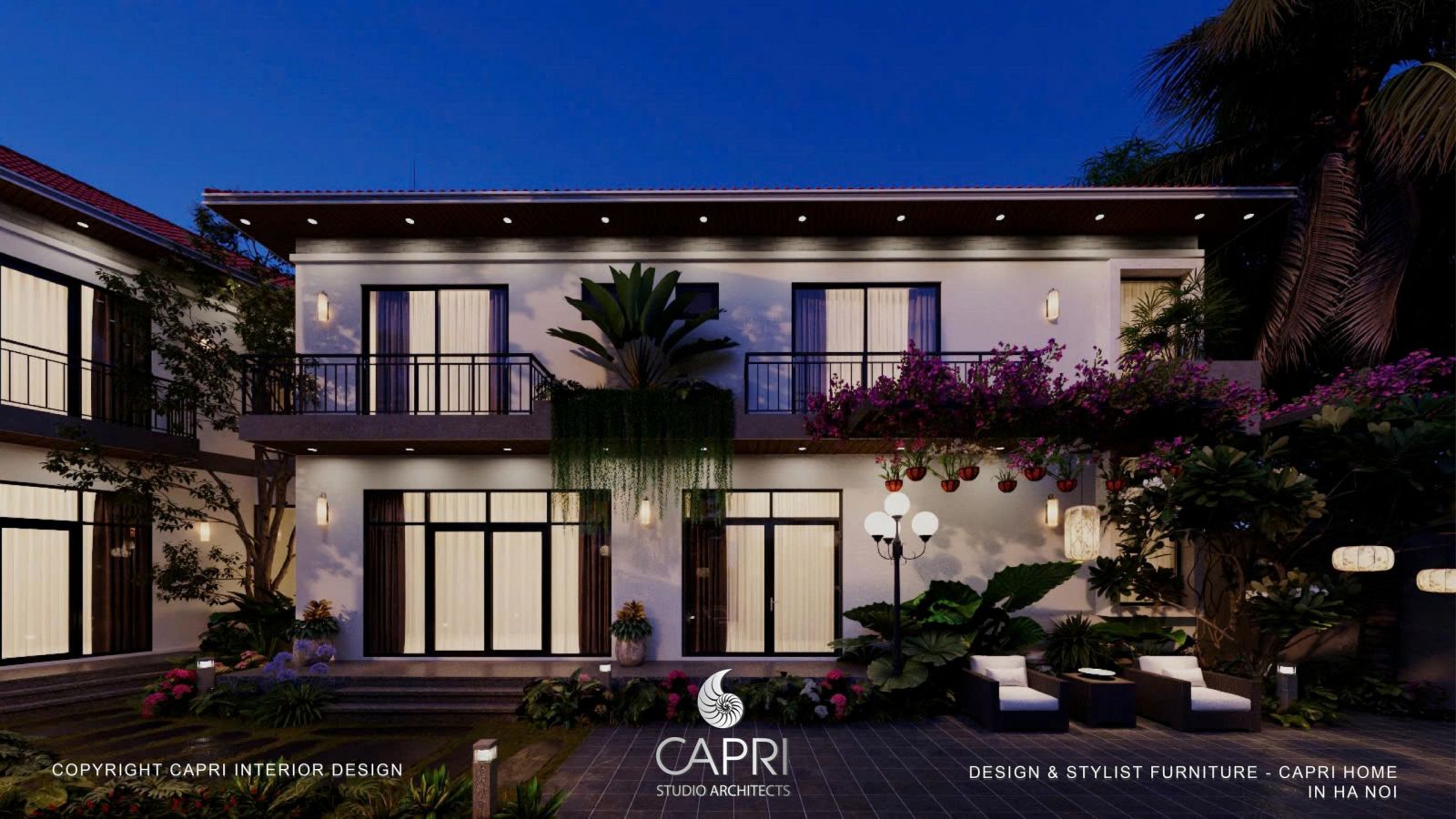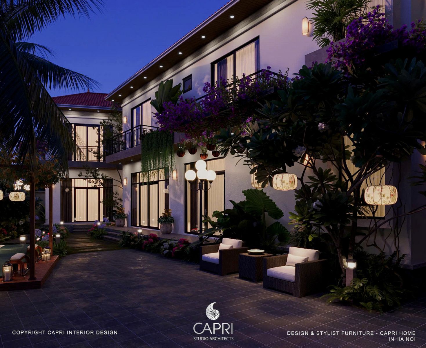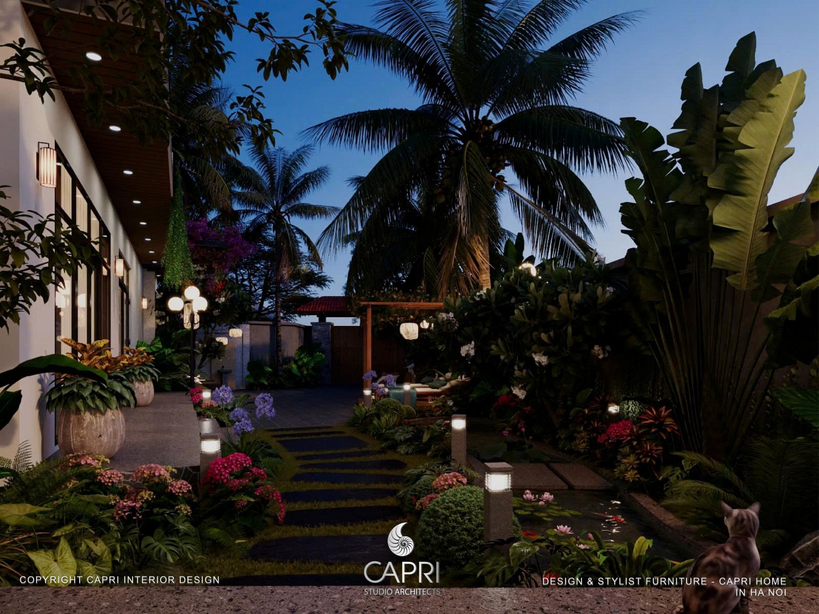 Bên trong, ánh sáng ấm áp từ Capri Home ôm lấy từng món nội thất, biến không gian thành những góc thư giãn ấm cúng. Bên ngoài, khu vườn chìm trong ánh sáng dịu nhẹ, nơi bóng cây in xuống lối đi như những tác phẩm nghệ thuật sống động.