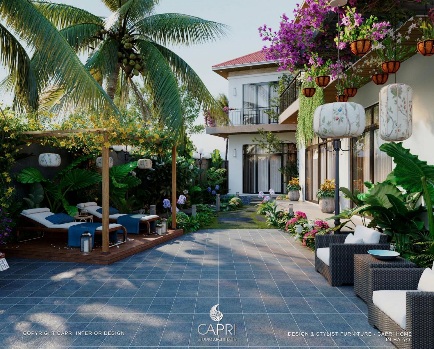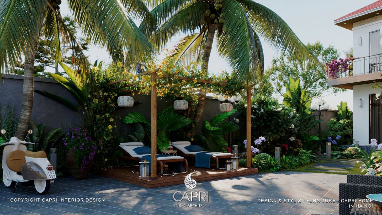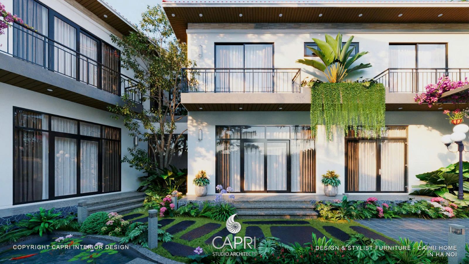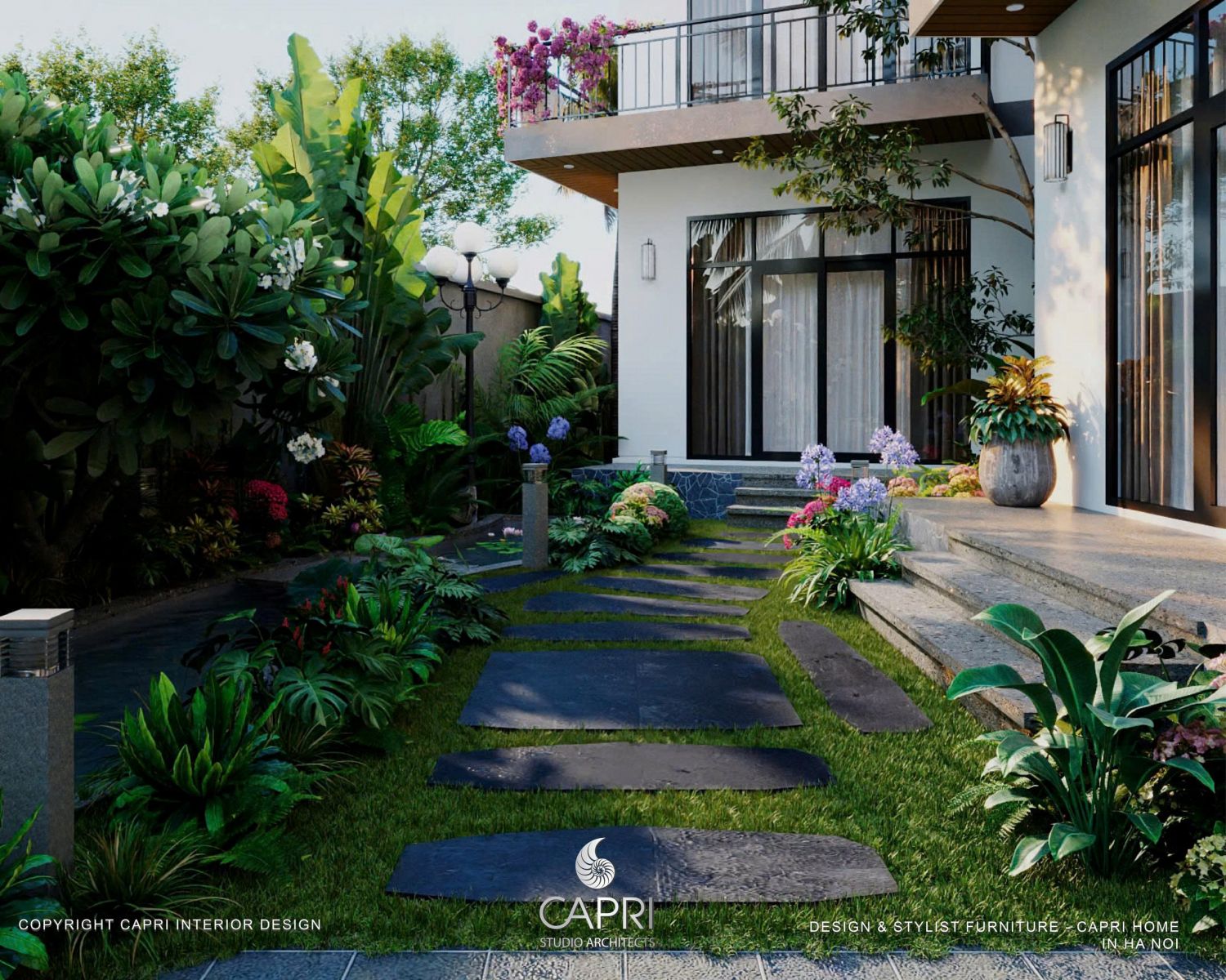 Bên trong, ánh sáng ấm áp từ Capri Home ôm lấy từng món nội thất, biến không gian thành những góc thư giãn ấm cúng. Bên ngoài, khu vườn chìm trong ánh sáng dịu nhẹ, nơi bóng cây in xuống lối đi như những tác phẩm nghệ thuật sống động.