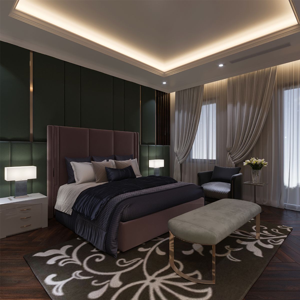Phòng ngủ Master là nơi nghỉ dưỡng tuyệt đối, nơi sự sang trọng được thể hiện qua sự giản lược. Sử dụng tông màu Đen và Xám lông chuột làm chủ đạo, Capri Studio Architects tạo ra một không gian ấm áp, thúc đẩy sự thư giãn sâu.