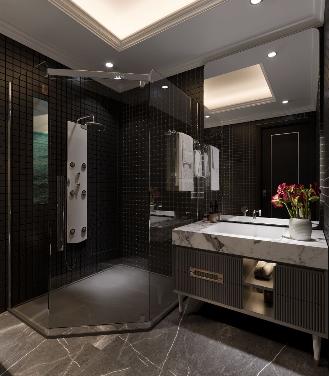 Nhà tắm được thiết kế như một khu vực Spa mini, nơi vật liệu cao cấp lên tiếng.Tường ốp gạch mosaic nhỏ màu đen tạo chiều sâu và độ tương phản kịch tính với bồn rửa mặt mặt đá cẩm thạch trắng vân mây.