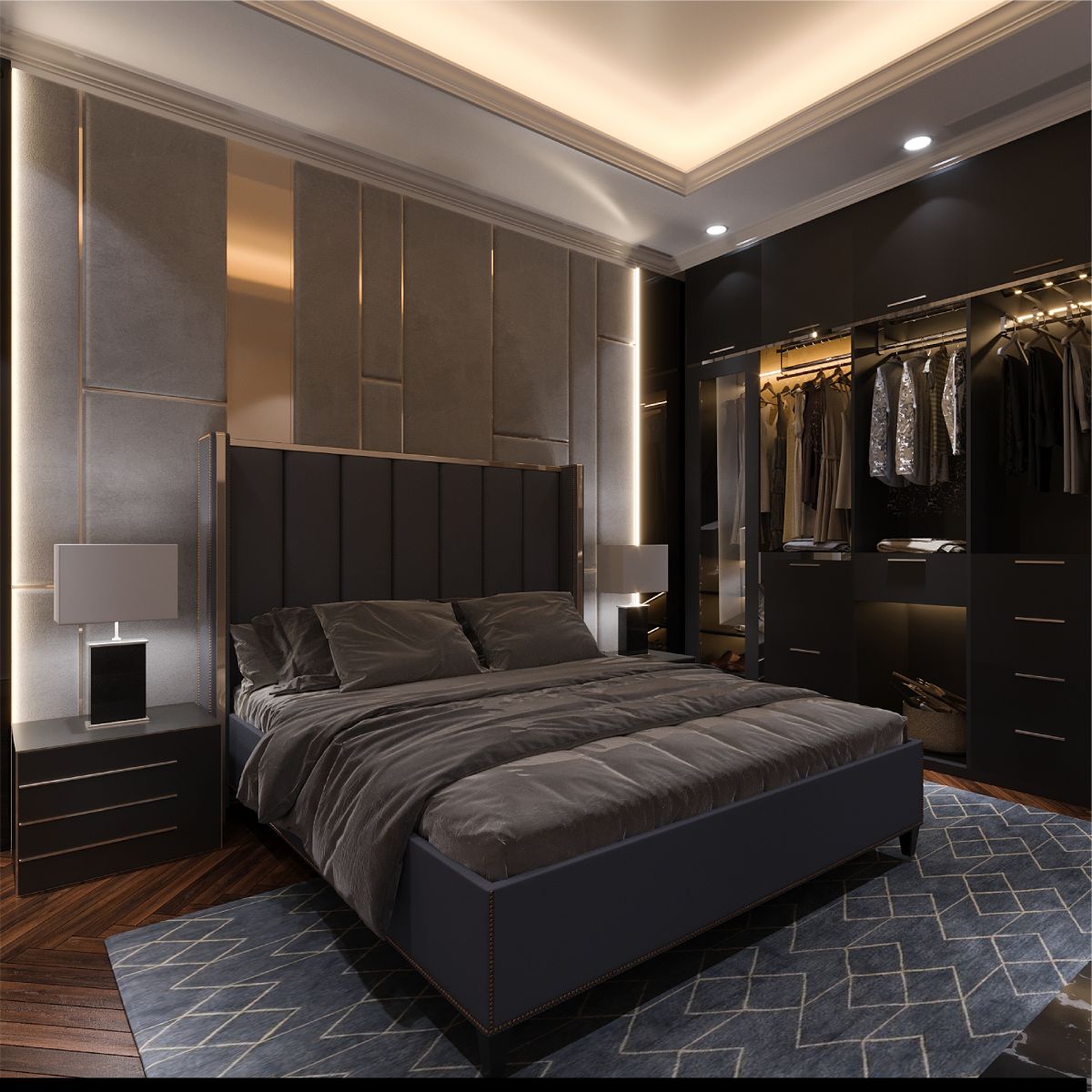 Phòng ngủ này thể hiện rõ nét phong cách Luxury Modern (Hiện đại Cao cấp), tập trung xây dựng một không gian nghỉ ngơi đầy tinh tế, đối xứng và đẳng cấp thông qua việc sử dụng bảng màu tối chủ đạo. Thiết kế này tạo ấn tượng mạnh mẽ nhờ sự kết hợp hài hòa giữa các vật liệu cao cấp như vải nhung của giường ngủ, sơn mài bóng của tủ đầu giường, và các mảng vật liệu tối màu trên tường ốp đầu giường. Điểm nhấn đắt giá nhất là các đường viền kim loại màu vàng đồng chạy dọc tường và tủ quần áo, giúp phá vỡ sự đơn điệu và phản chiếu ánh sáng, làm tăng chiều sâu và vẻ lộng lẫy cho căn phòng. Hệ thống chiếu sáng đa lớp (đèn hắt trần, đèn spotlight, đèn trang trí) màu vàng ấm được bố trí khéo léo, không chỉ làm nổi bật kết cấu mà còn tạo cảm giác ấm cúng, thư giãn tối đa. Tổng thể căn phòng là sự cân bằng hoàn hảo giữa tính thẩm mỹ sang trọng, sự gọn gàng nhờ hệ tủ quần áo mở tích hợp đèn LED lớn, và một không gian nghỉ dưỡng mang đậm phong cách cá nhân và đẳng cấp.