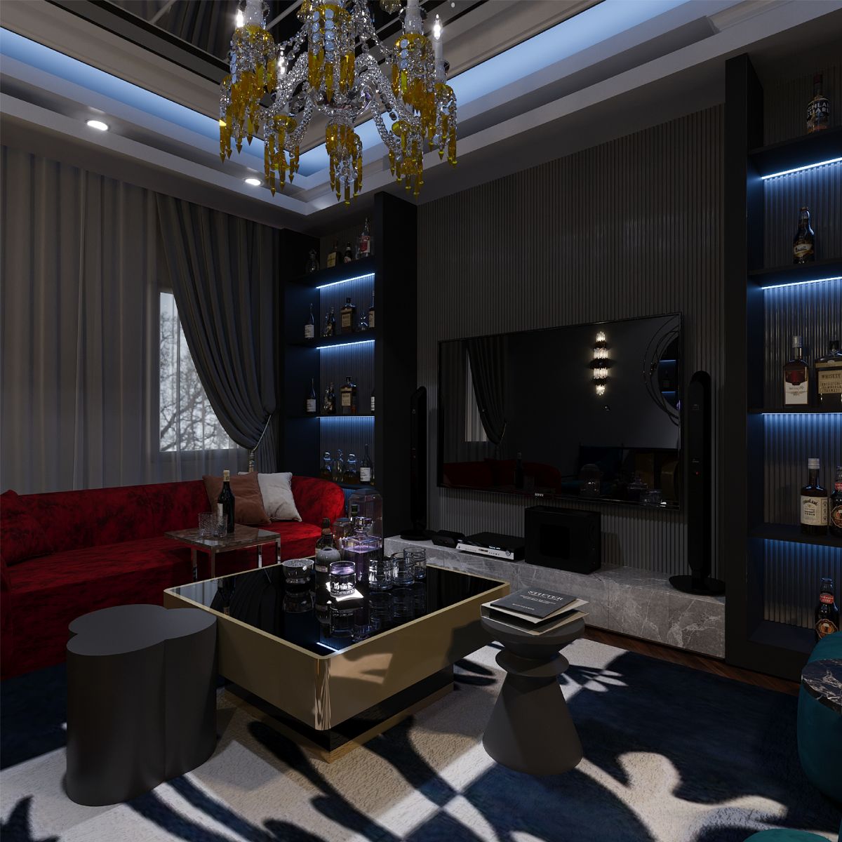 Capri Studio Architects đã tạo ra một không gian giải trí đầy cá tính và đối lập mạnh mẽ. Sử dụng tông màu đen, xám than chì và ánh sáng LED màu xanh lam (Backlit) cho các kệ trưng bày rượu, tạo cảm giác huyền bí và sang trọng như một Club Lounge cao cấp.