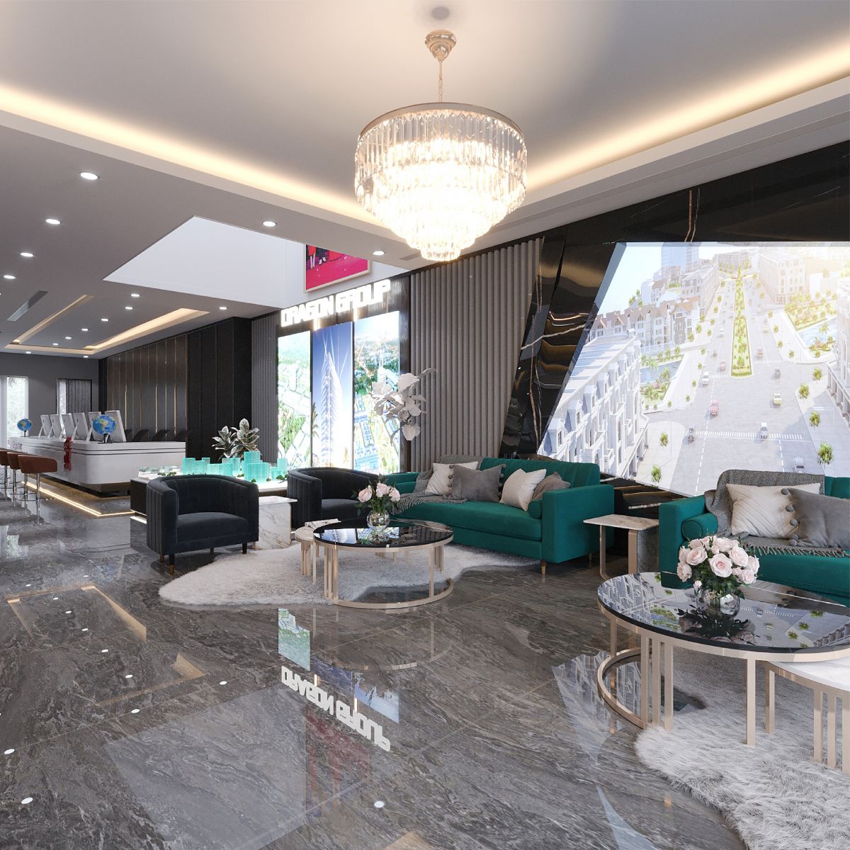 Khu vực lounge tâm điểm là bộ sofa và ghế đơn bọc nhung/da, đặc biệt là sofa màu Xanh Teal/Ngọc Lục Bảo quý phái, được đặt trên thảm lông mềm mại, mời gọi khách hàng thư giãn. Ánh sáng từ đèn chùm pha lê cỡ lớn như vương miện của không gian.
