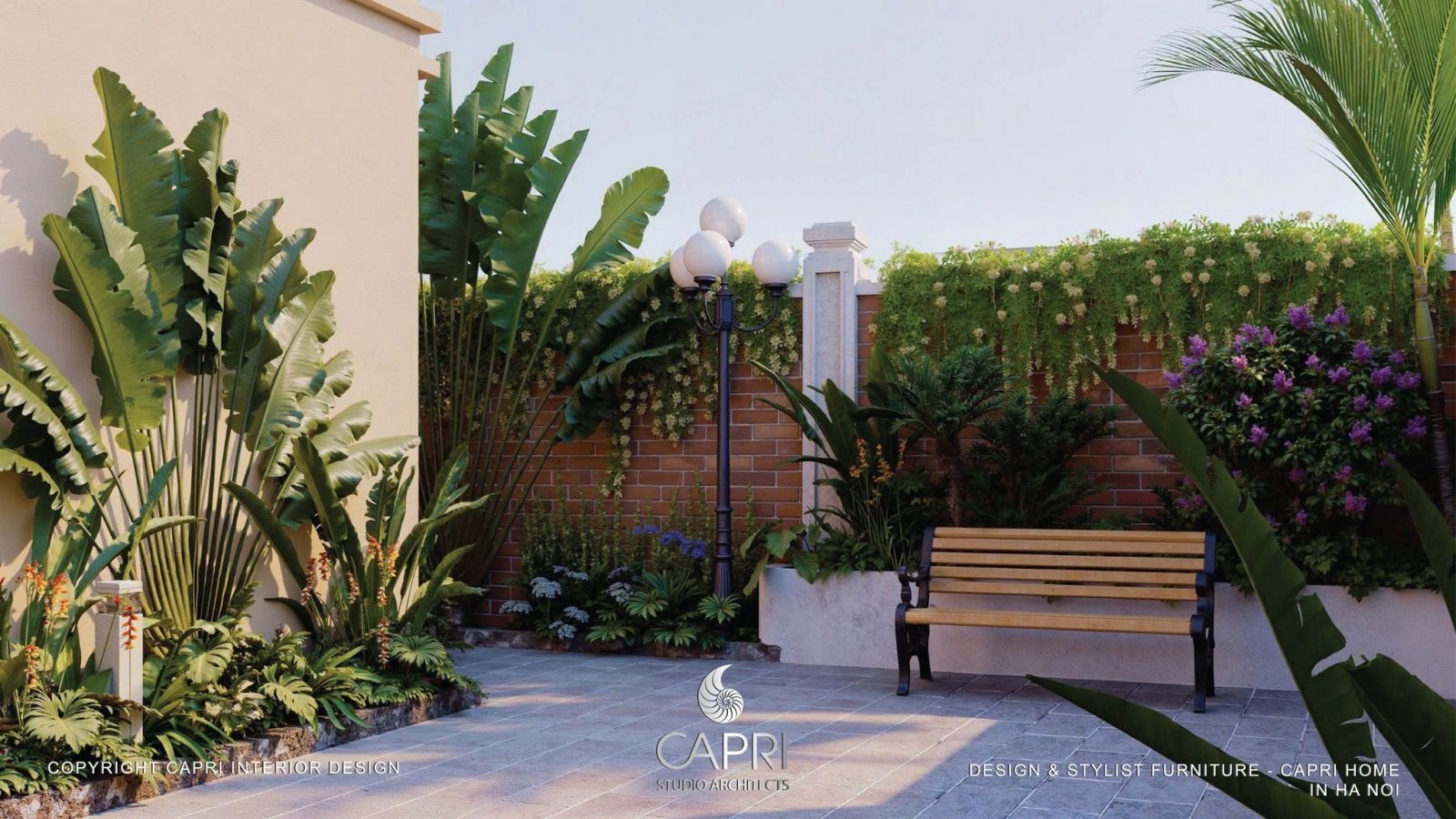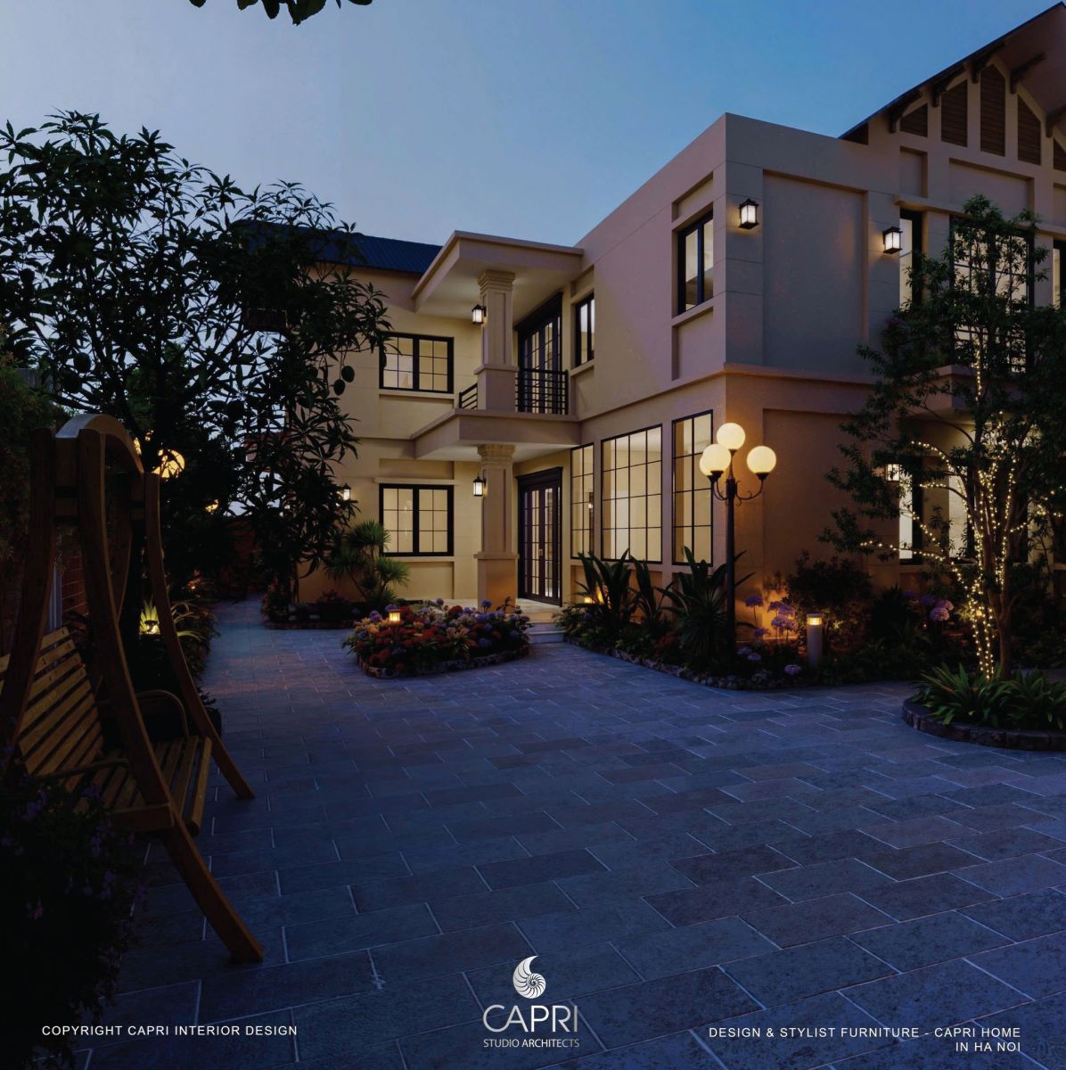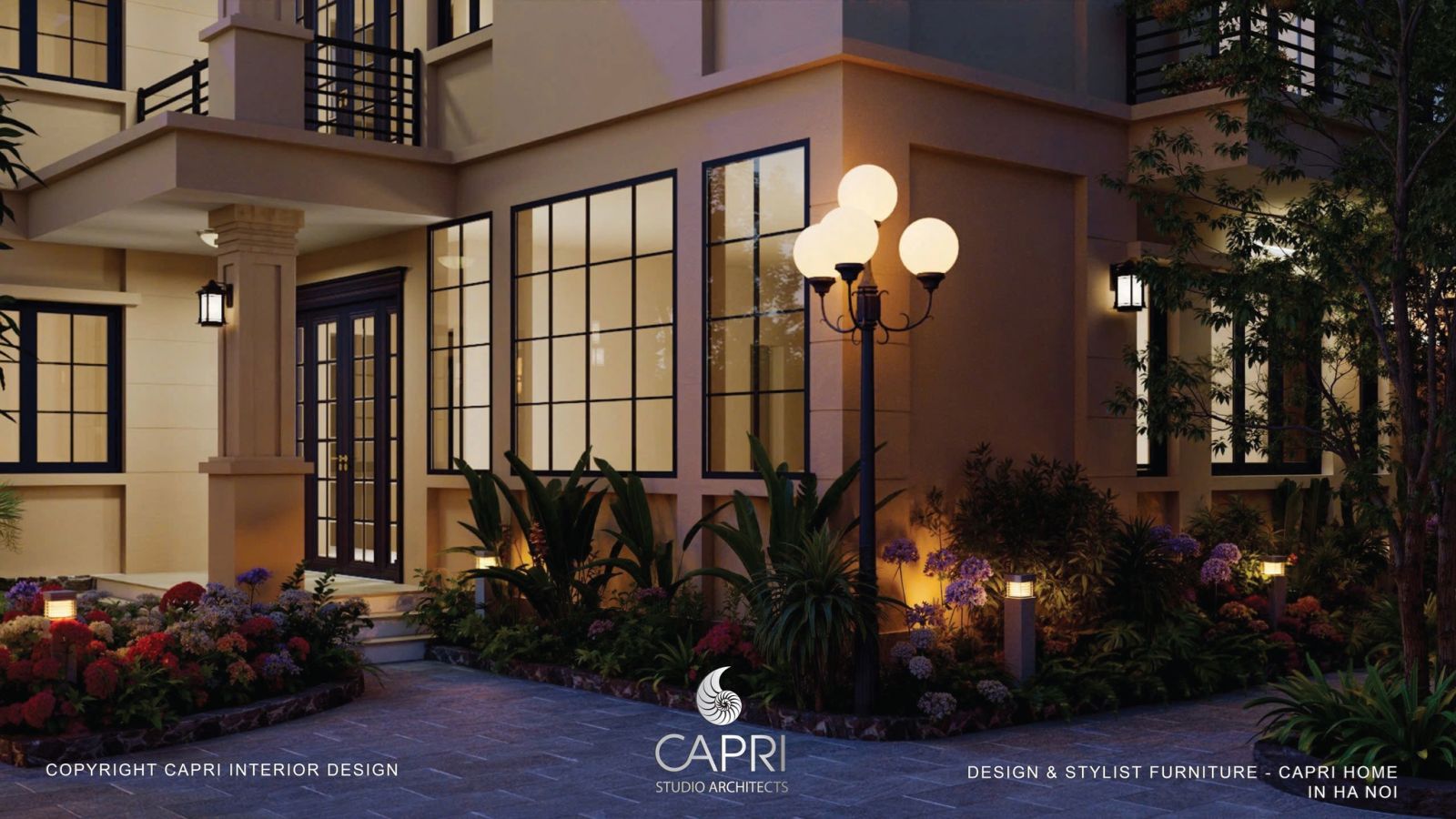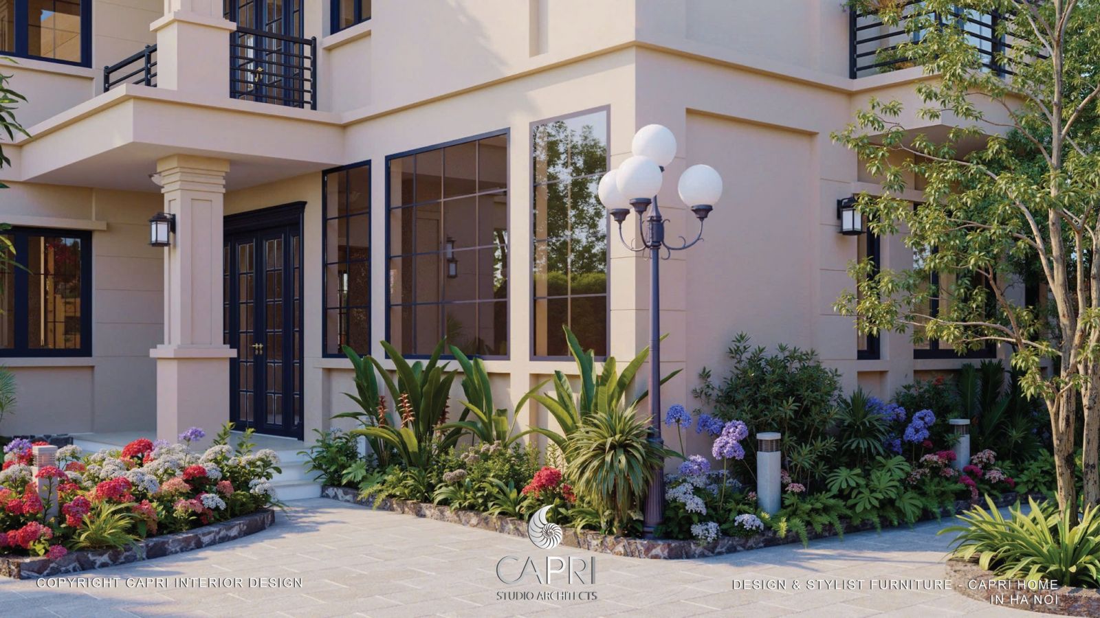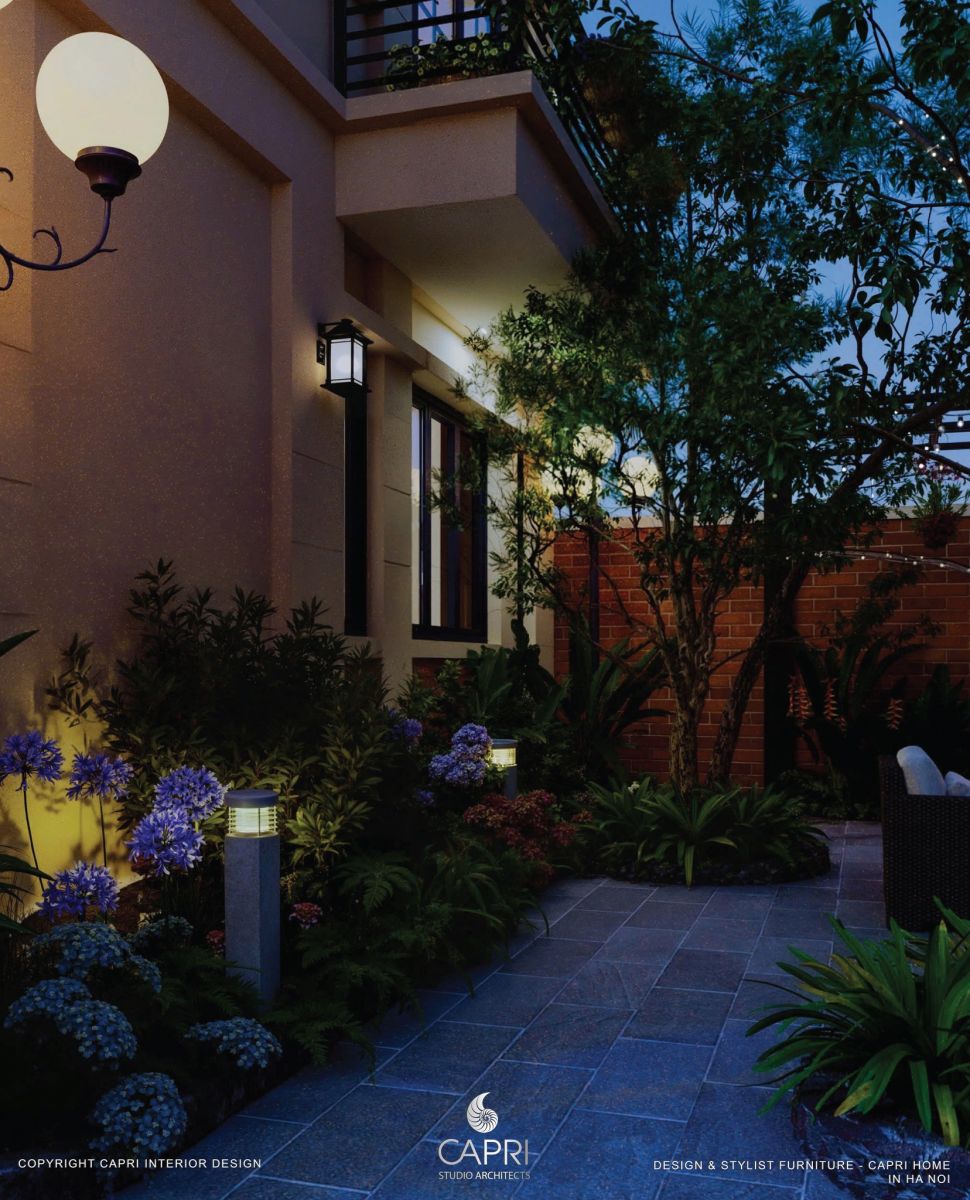 Không gian là sự hòa quyện tinh tế giữa kiến trúc và thiên nhiên: mảng tường be hiện đại với khung kính đen phản chiếu ánh sáng, kết hợp mái hiên gỗ – vòm đá mang hơi thở Địa Trung Hải. Lối sân rộng thoáng được dẫn dắt bởi hệ cảnh quan nhiều lớp, hoa lá rực rỡ và giàn hoa giấy tím mềm mại, tạo nên một khung cảnh đậm chất nghỉ dưỡng. Tất cả tạo thành một tổng thể hài hòa, sang trọng nhưng gần gũi – đúng tinh thần thiết kế tinh tế của Capri Home.