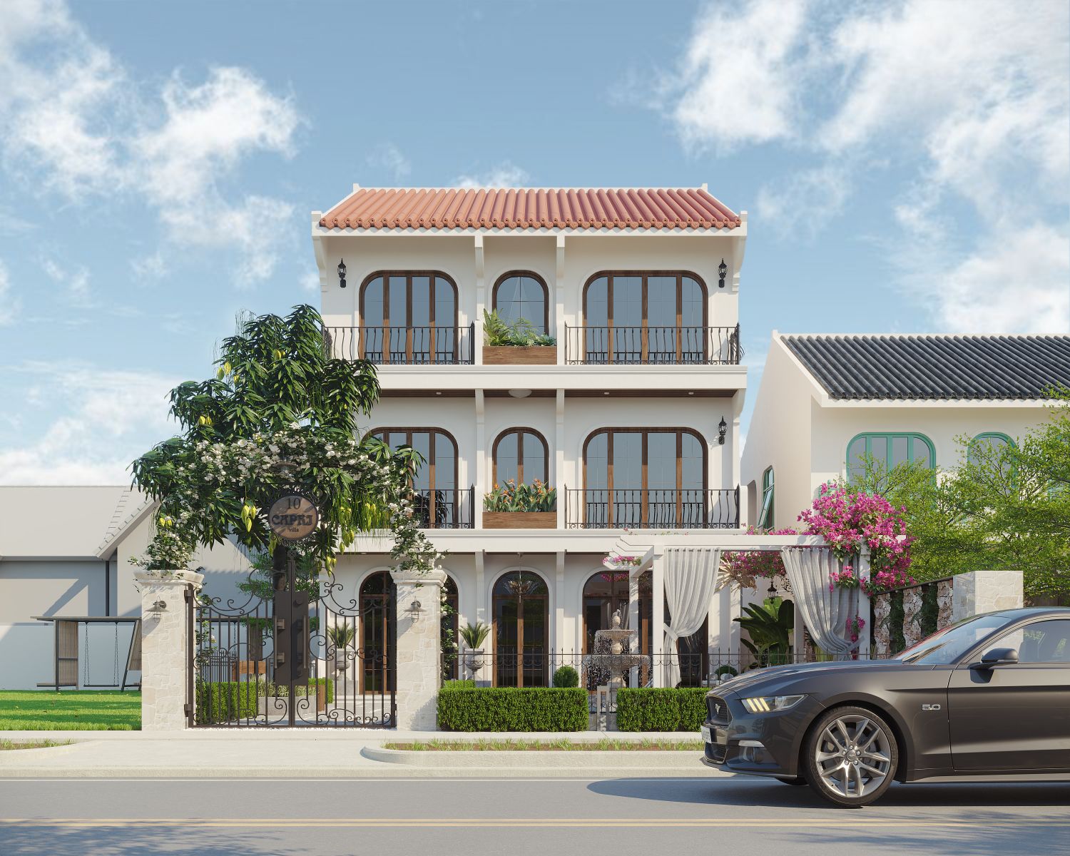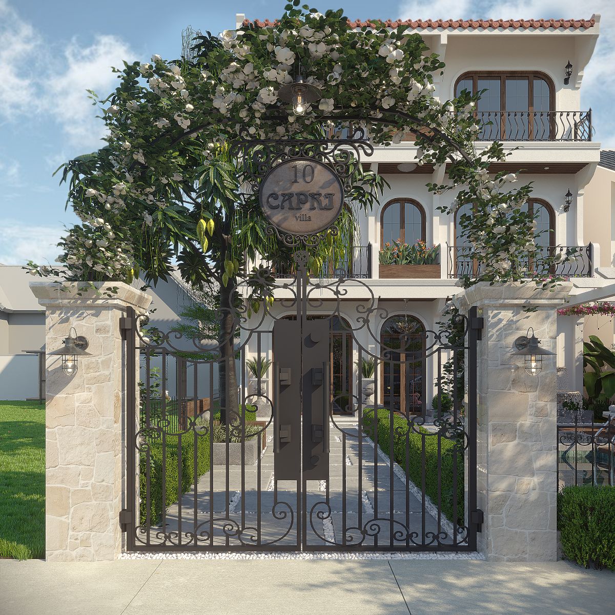 Nhìn từ đường phố, kiến trúc villa nổi bật với hình thức 3 tầng thanh thoát, nhịp điệu đều đặn bởi các vòm cong lớn – chi tiết đặc trưng tạo nên sự mềm mại và đậm chất resort. Các ban công sắt mỹ thuật kết hợp cùng khung cửa gỗ tone ấm tạo cảm giác gần gũi, sang trọng mà không phô trương. Hệ mái ngói nâu gạch truyền thống gợi nhắc vẻ đẹp cổ kính của Hội An, nhưng được xử lý hiện đại để phù hợp với công năng và khí hậu. Cổng chính sử dụng đá tự nhiên kết hợp sắt rèn thủ công, tạo nên diện mạo đẳng cấp ngay từ bước chân đầu tiên.