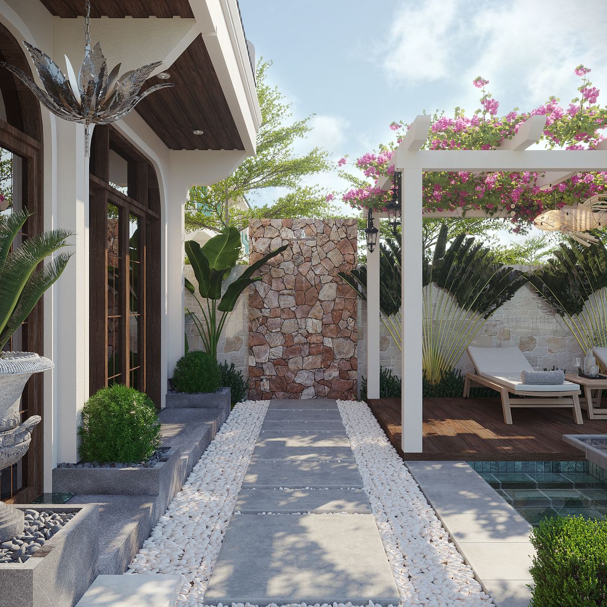 Điểm nhấn nổi bật là khu giàn pergola phủ hoa giấy hồng rực rỡ, vừa mang nét mềm mại, vừa tạo sắc thái lãng mạn đặc trưng của những khu nghỉ dưỡng miền biển. Không gian bên dưới pergola được bố trí khu thư giãn ngoài trời – nơi ánh nắng và gió biển được điều tiết vừa đủ qua các thanh lam trắng tinh tế.