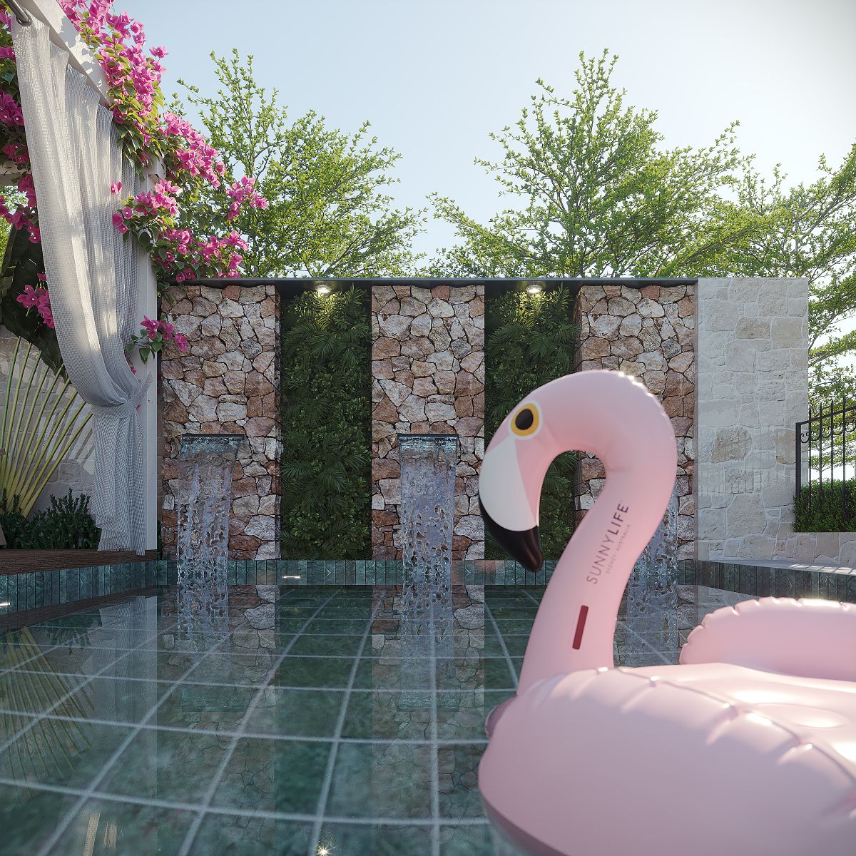 Bể nước và thảm xanh được đặt có chủ đích, mở ra góc nhìn thoáng đãng nhưng vẫn tạo sự riêng tư, đúng tinh thần của một villa nghỉ dưỡng cao cấp.
