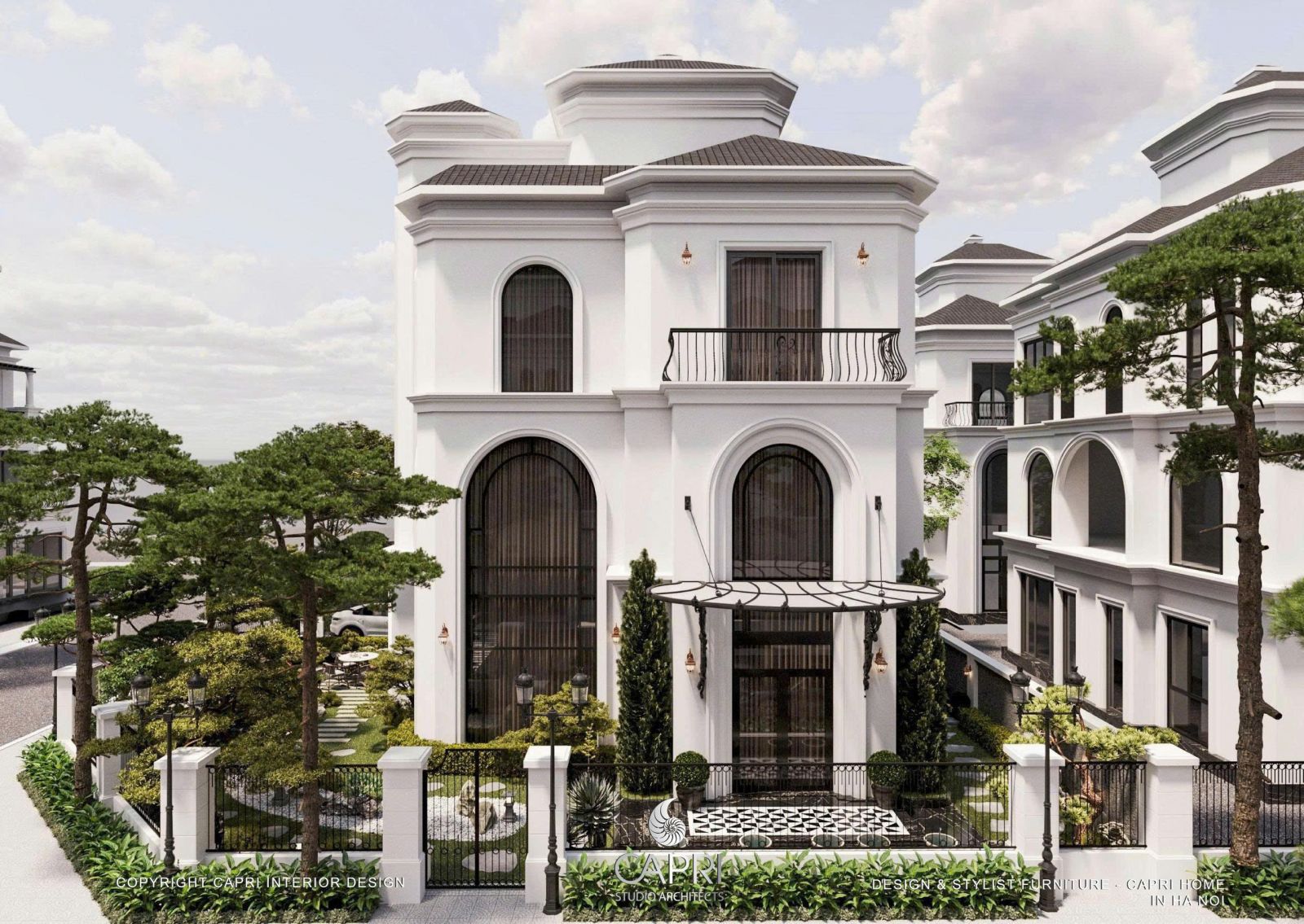 Phong cách Tân cổ điển được lựa chọn làm ngôn ngữ chủ đạo cho dự án. Đây là phong cách đòi hỏi trình độ thiết kế cao, bởi mỗi đường nét đều phải được tiết chế hợp lý để vừa giữ được tinh thần cổ điển sang trọng, vừa đáp ứng nhu cầu sống hiện đại. Capri Studio Architects ứng dụng Golden Ratio trong toàn bộ cấu trúc hình khối, từ chiều cao tầng, nhịp điệu cột, ban công đến hệ cửa vòm. Tỷ lệ này giúp công trình đạt đến sự hài hòa tự nhiên, tạo cảm giác vững chãi, bề thế nhưng không phô trương, mang đậm khí chất của những dinh thự châu Âu cổ điển.