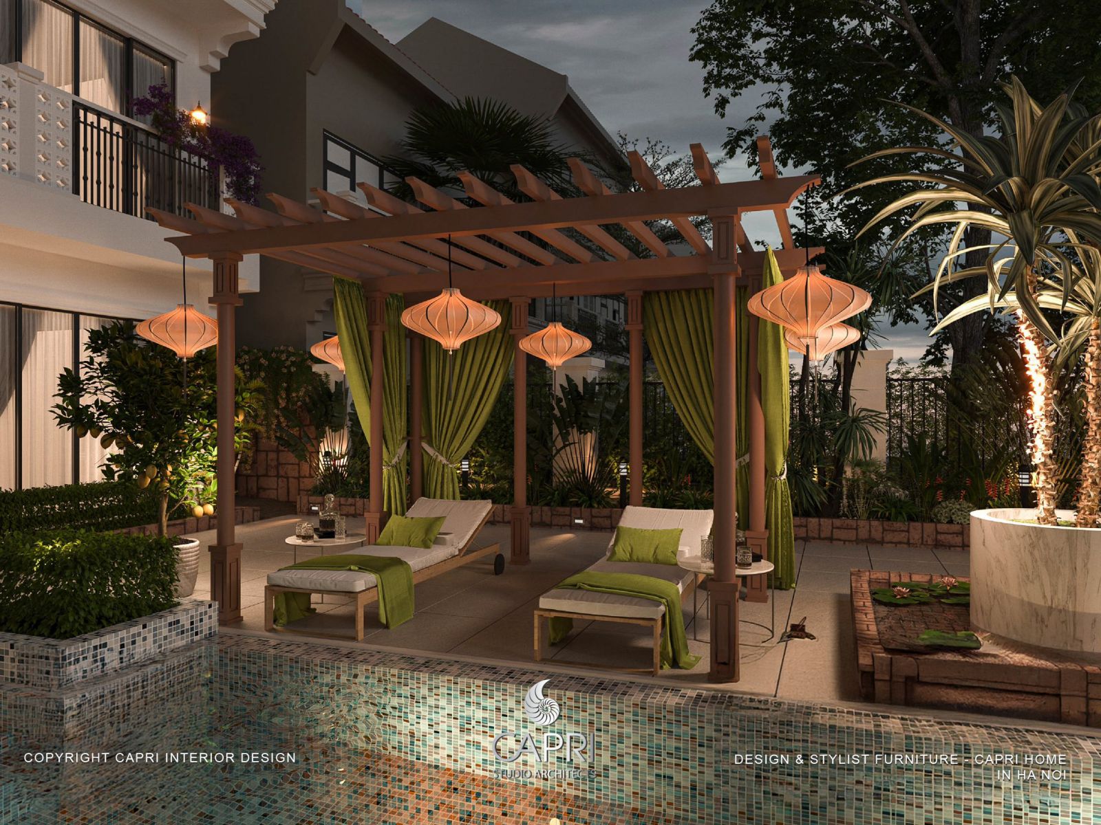 Thay vì sử dụng những bụi cây cắt tỉa hình học đặc trưng của vườn châu Âu, khuôn viên CAPRI ưu tiên các loại cây bản địa như dương xỉ, cau cảnh, tre trúc… tạo nên những mảng xanh đa tầng, phong phú về chiều cao và nhịp điệu. Cách phối thảm thực vật này giúp không gian vừa gần gũi thiên nhiên vừa đảm bảo tính thẩm mỹ chuẩn resort nhiệt đới.