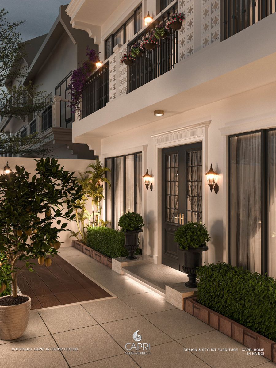 Mặt tiền mỗi villa là một bài học về tỷ lệ vàng trong kiến trúc. Các kiến trúc sư Capri Studio đã sử dụng hệ thống "pilaster" (nửa cột) và "cornice" (phần mái đua) được cách điệu, làm sống dậy vẻ đẹp của kiến trúc Pháp thế kỷ 19. Điểm nhấn đặc biệt là hệ thống cửa sổ "French window" cao từ sàn đến trần, không chỉ tăng tối đa ánh sáng tự nhiên mà còn tạo ra hiệu ứng "mở" không gian, xóa nhòa ranh giới trong - ngoài. Những ô cửa này được viền bởi các đường chỉ phào (moulding) tinh xảo, chứng tỏ sự tỉ mỉ trong thi công.