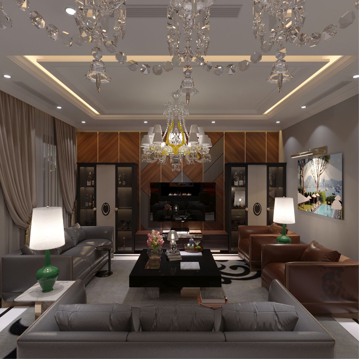 Vách TV sử dụng nghệ thuật ốp gỗ vân chéo hoặc vân hình học, kết hợp với hệ tủ trưng bày hai bên. Các tủ này có cửa kính màu khói, tích hợp đèn LED, biến bộ sưu tập rượu và vật phẩm thành tác phẩm nghệ thuật. Bên cạnh đèn chùm lớn, việc sử dụng các đèn bàn đế gốm màu xanh lá/ngọc tạo ra ánh sáng cục bộ ấm áp, phá vỡ sự lạnh lẽo của tông màu trầm.