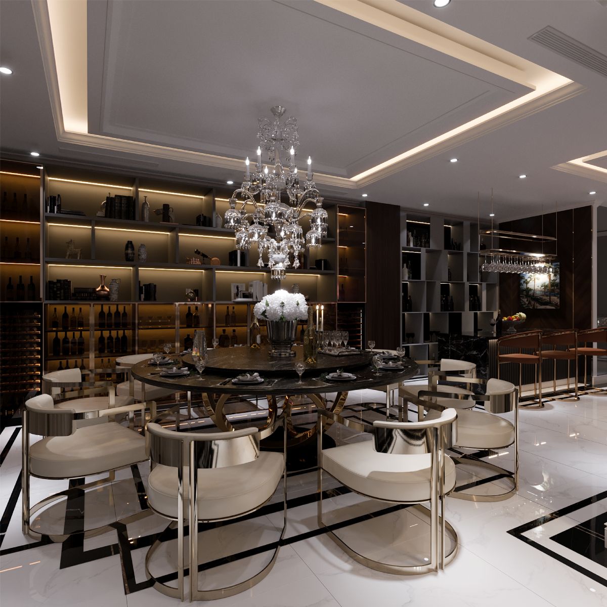 Tường tủ rượu tích hợp kéo dài với ánh sáng vàng hắt tinh tế, không chỉ là nơi lưu trữ mà còn là phông nền ấn tượng cho bữa ăn. Đây là sự kết hợp hoàn hảo giữa không gian ẩm thực và Quầy Bar mini tại gia.