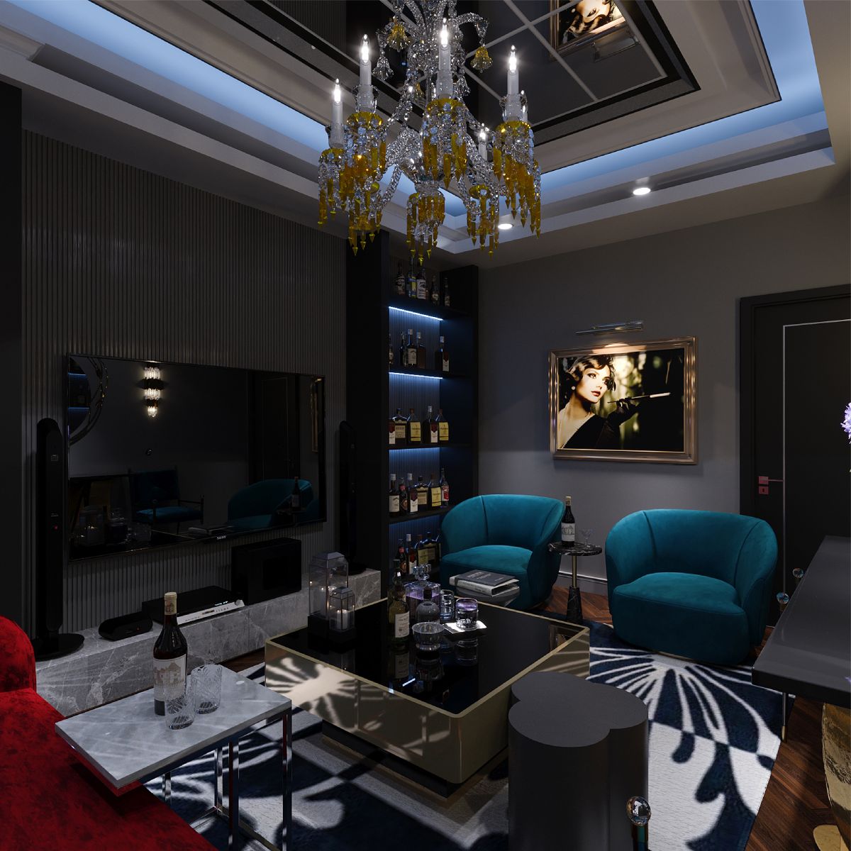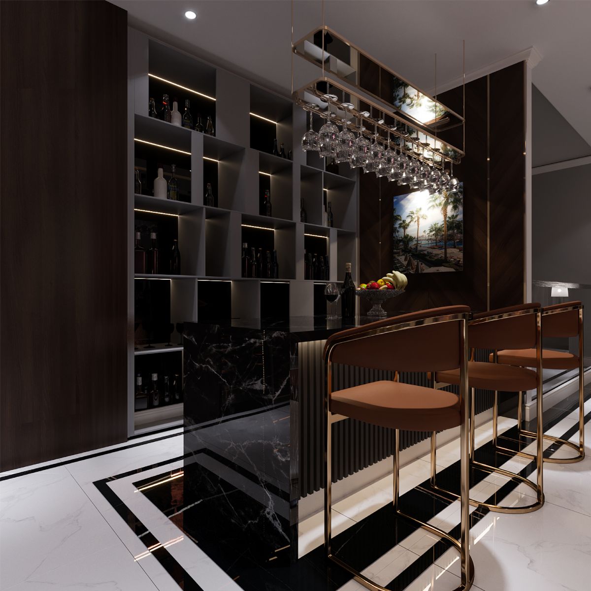 Capri Studio Architects đã tạo ra một không gian giải trí đầy cá tính và đối lập mạnh mẽ. Sử dụng tông màu đen, xám than chì và ánh sáng LED màu xanh lam (Backlit) cho các kệ trưng bày rượu, tạo cảm giác huyền bí và sang trọng như một Club Lounge cao cấp.