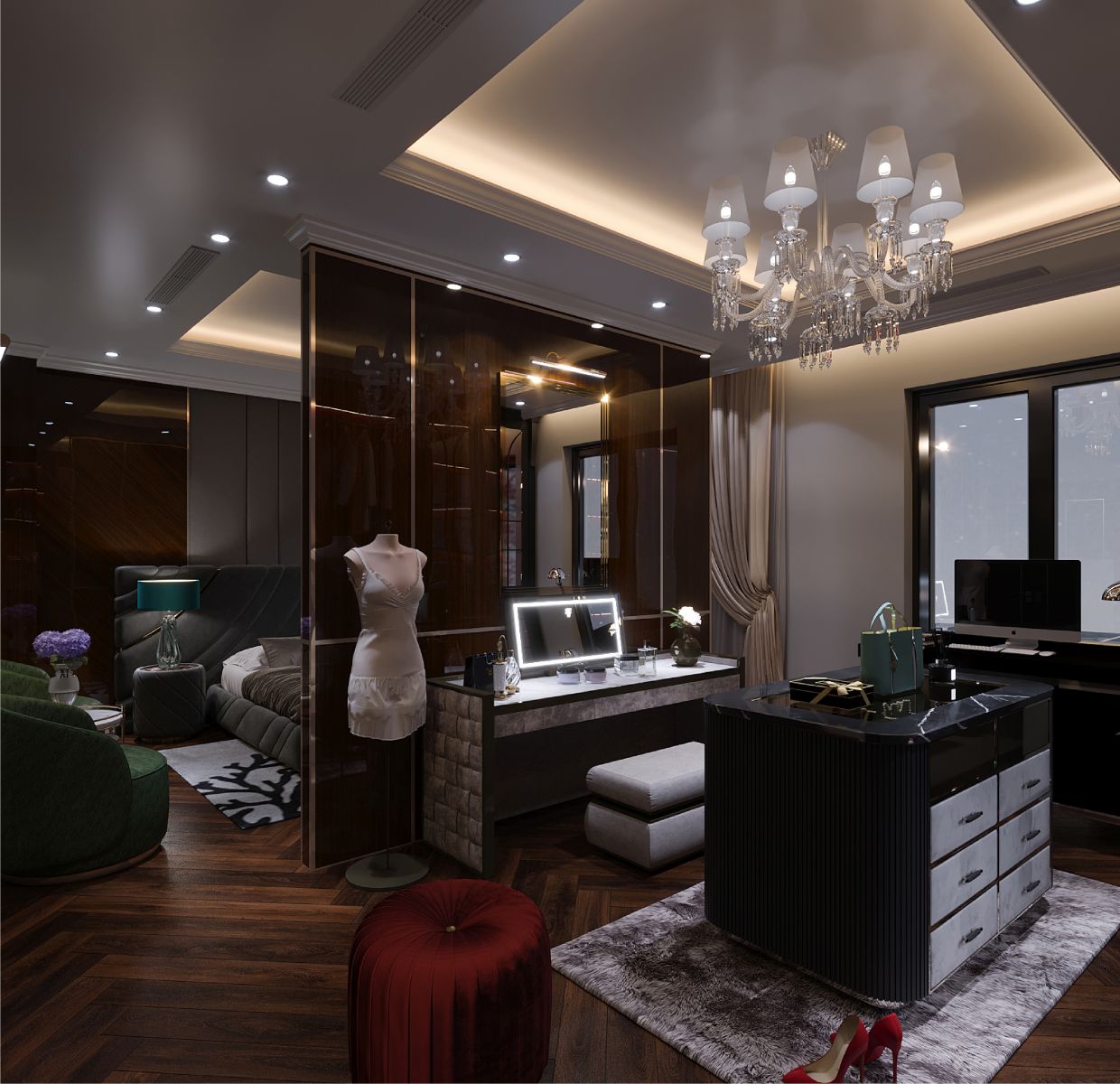 Nối liền với phòng ngủ Master là khu vực dành riêng cho việc chăm sóc bản thân và thời trang. Tủ đảo trung tâm mặt đá đen với nhiều ngăn kéo để lưu trữ trang sức và phụ kiện. Đây là chi tiết không thể thiếu trong các Villa Luxury. Bàn trang điểm lớn, mặt đá, với gương có đèn LED bao quanh đảm bảo ánh sáng chuẩn xác.