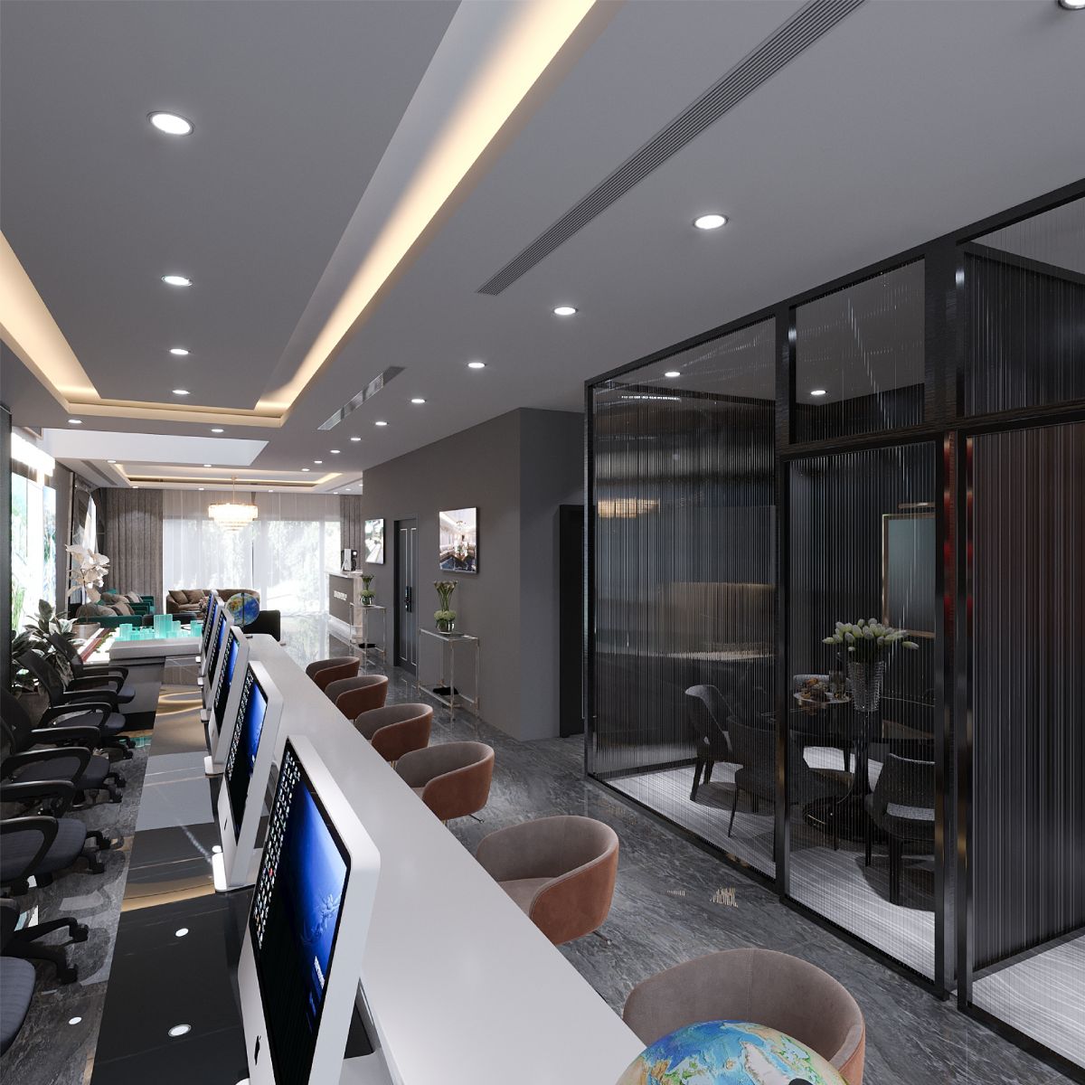 Sảnh tầng trệt của Villa được thiết kế đa năng, phục vụ như một Phòng giao dịch/Sảnh tiếp khách doanh nhân, nơi công việc và nghệ thuật gặp gỡ. Sàn được lát bằng đá cẩm thạch tối màu vân mây, tạo cảm giác vững chãi và chiều sâu vô tận. Điểm đối lập là quầy giao dịch và bàn làm việc mặt trắng, tối ưu hóa sự tập trung và tính chuyên nghiệp.