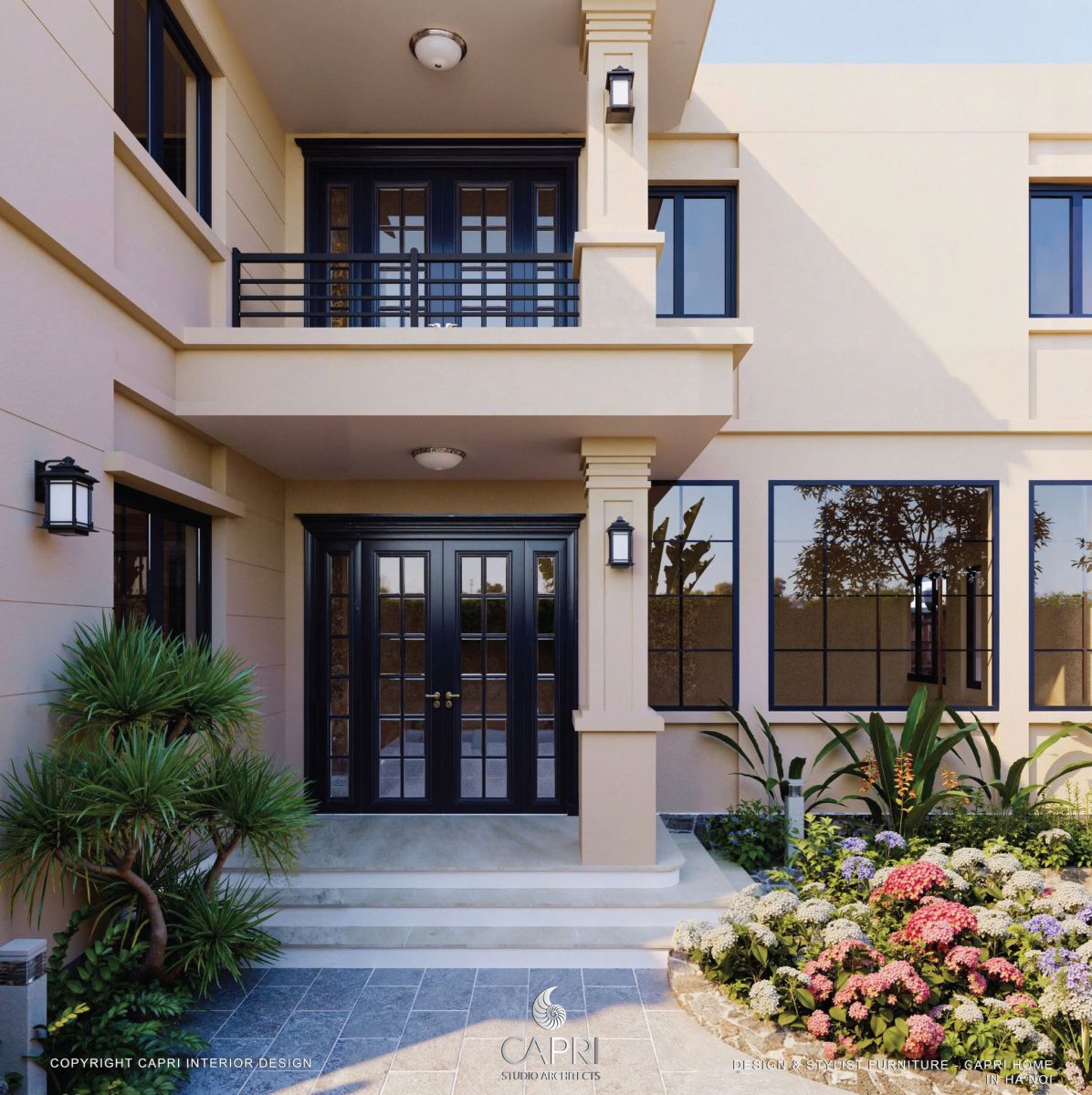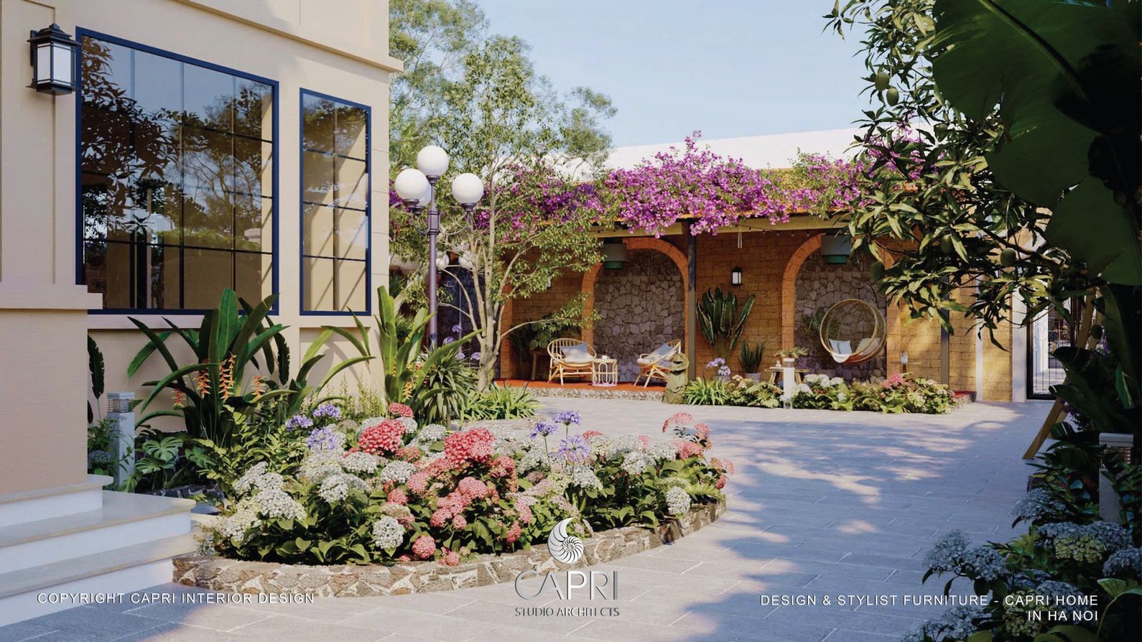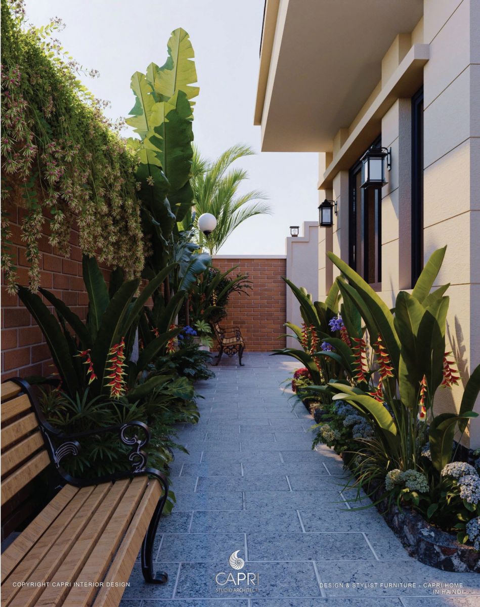 Không gian là sự hòa quyện tinh tế giữa kiến trúc và thiên nhiên: mảng tường be hiện đại với khung kính đen phản chiếu ánh sáng, kết hợp mái hiên gỗ – vòm đá mang hơi thở Địa Trung Hải. Lối sân rộng thoáng được dẫn dắt bởi hệ cảnh quan nhiều lớp, hoa lá rực rỡ và giàn hoa giấy tím mềm mại, tạo nên một khung cảnh đậm chất nghỉ dưỡng. Tất cả tạo thành một tổng thể hài hòa, sang trọng nhưng gần gũi – đúng tinh thần thiết kế tinh tế của Capri Home.
