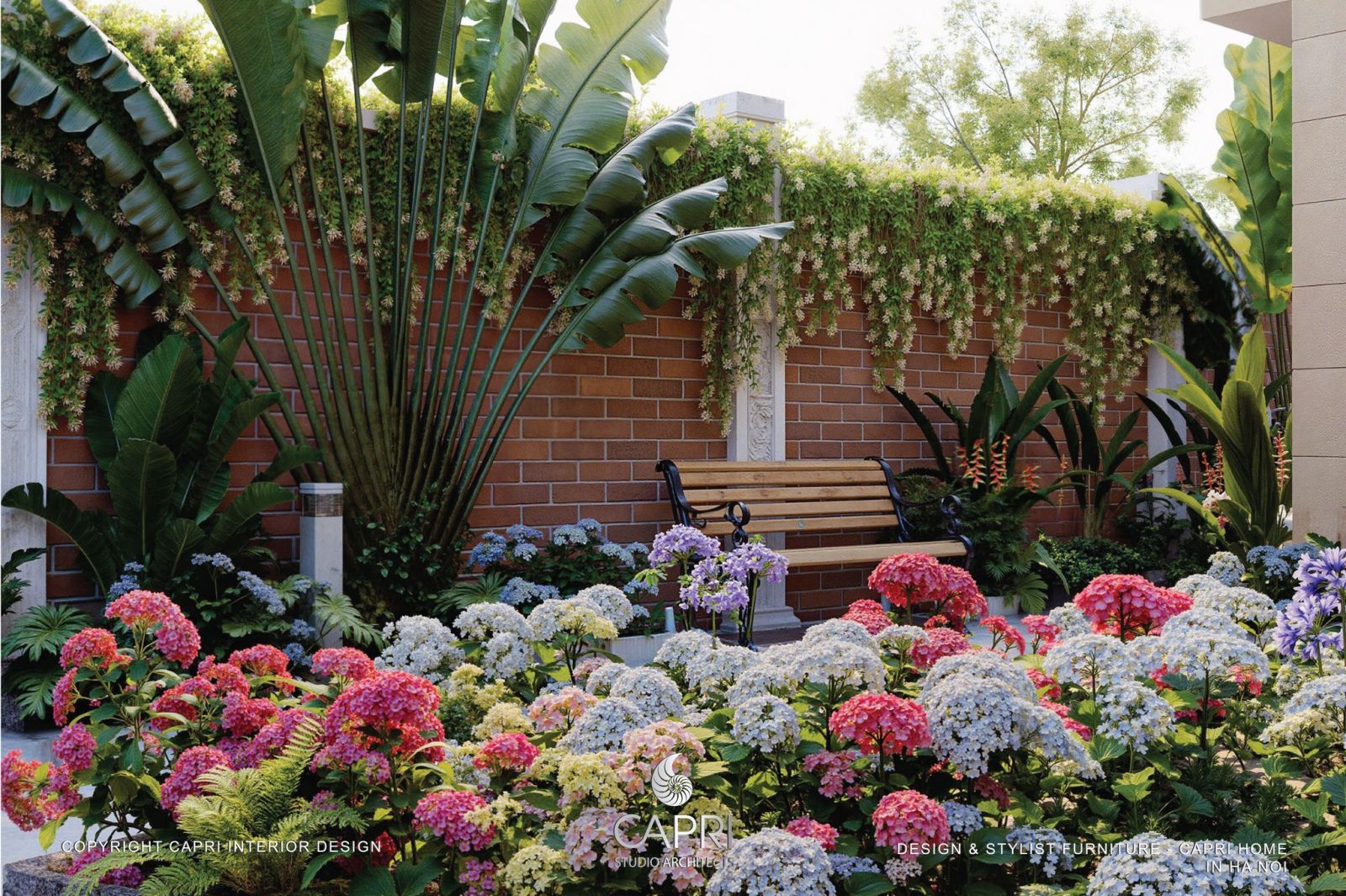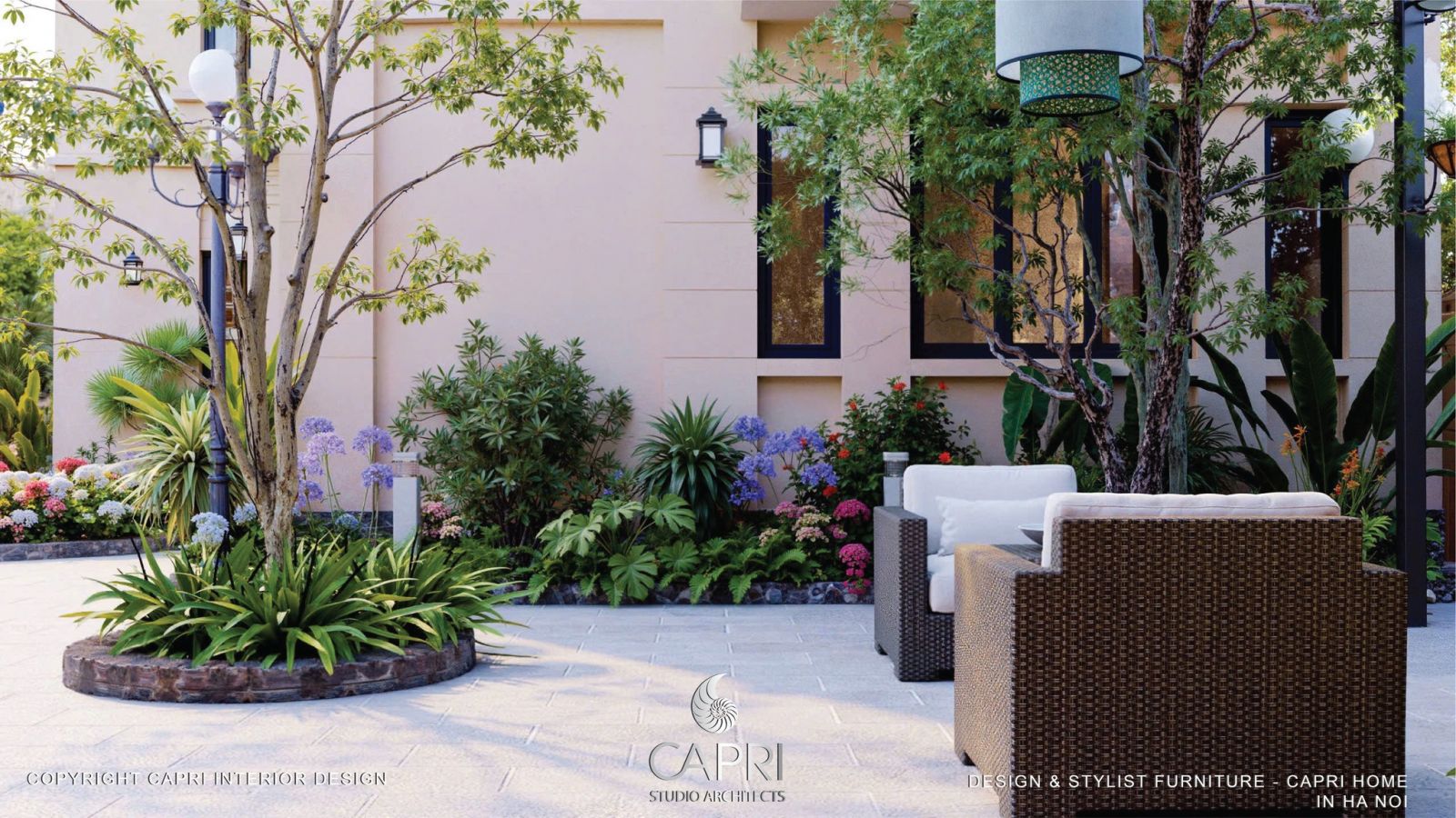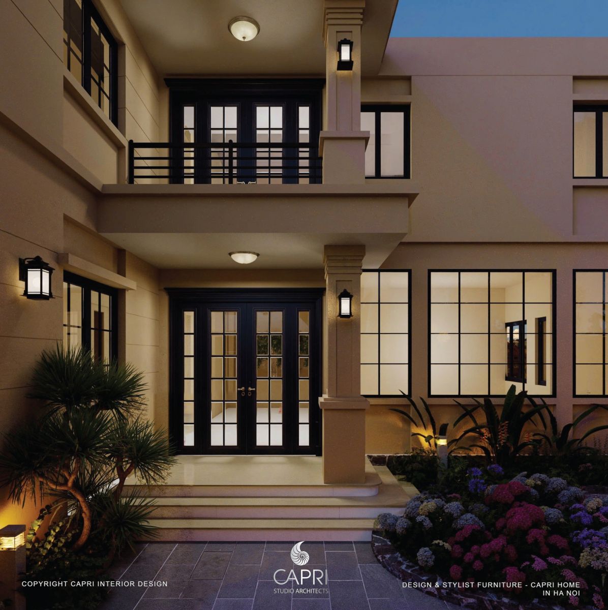 Không gian là sự hòa quyện tinh tế giữa kiến trúc và thiên nhiên: mảng tường be hiện đại với khung kính đen phản chiếu ánh sáng, kết hợp mái hiên gỗ – vòm đá mang hơi thở Địa Trung Hải. Lối sân rộng thoáng được dẫn dắt bởi hệ cảnh quan nhiều lớp, hoa lá rực rỡ và giàn hoa giấy tím mềm mại, tạo nên một khung cảnh đậm chất nghỉ dưỡng. Tất cả tạo thành một tổng thể hài hòa, sang trọng nhưng gần gũi – đúng tinh thần thiết kế tinh tế của Capri Home.