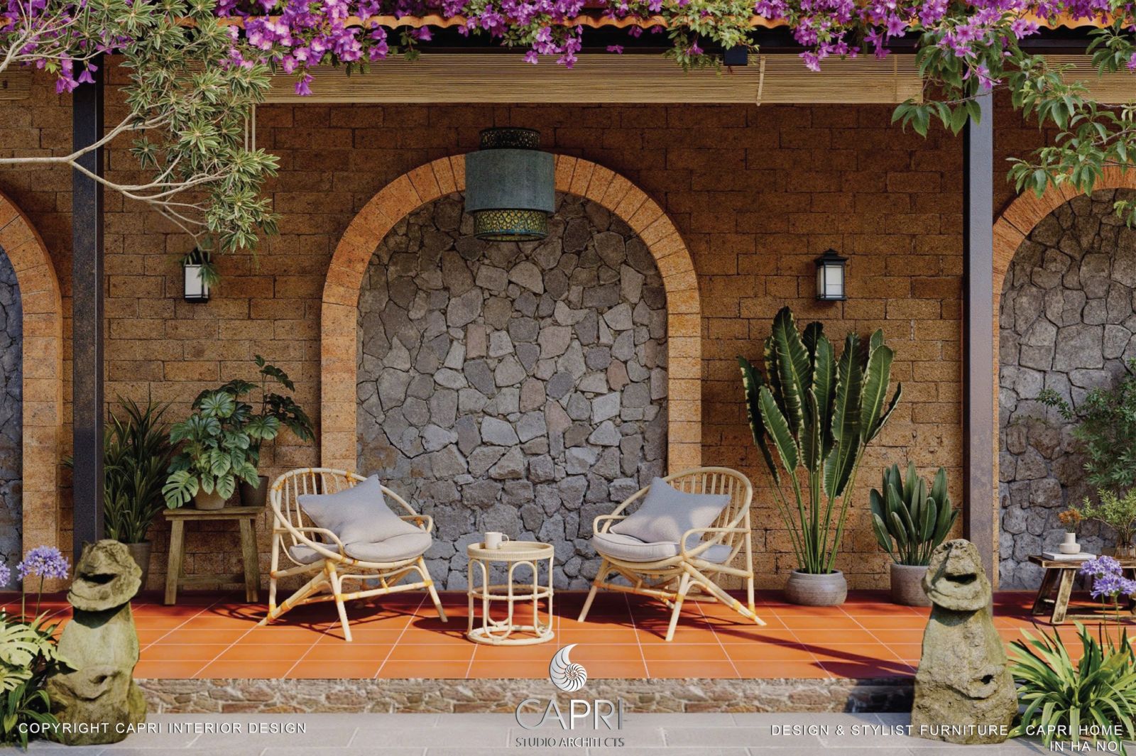Không gian này là một lời mời gọi đến sự thư thái, nơi mà vẻ đẹp mộc mạc và gần gũi với thiên nhiên được đặt lên hàng đầu. Hai chiếc ghế mây tre đan ấm cúng, đặt đối xứng dưới mái vòm gạch cổ kính, tạo nên một khu vực nghỉ ngơi lý tưởng. Bức tường gạch thô và bức phù điêu đá cuội ở trung tâm mang đến cảm giác hoài niệm và chân thực, trong khi những chậu cây xanh nhiệt đới và hoa rực rỡ điểm xuyết cho không gian thêm phần sống động. Dàn hoa giấy tím rủ xuống từ mái hiên là điểm nhấn quyến rũ, tạo nên một khung cảnh thơ mộng và bình yên, nơi thời gian dường như chậm lại.