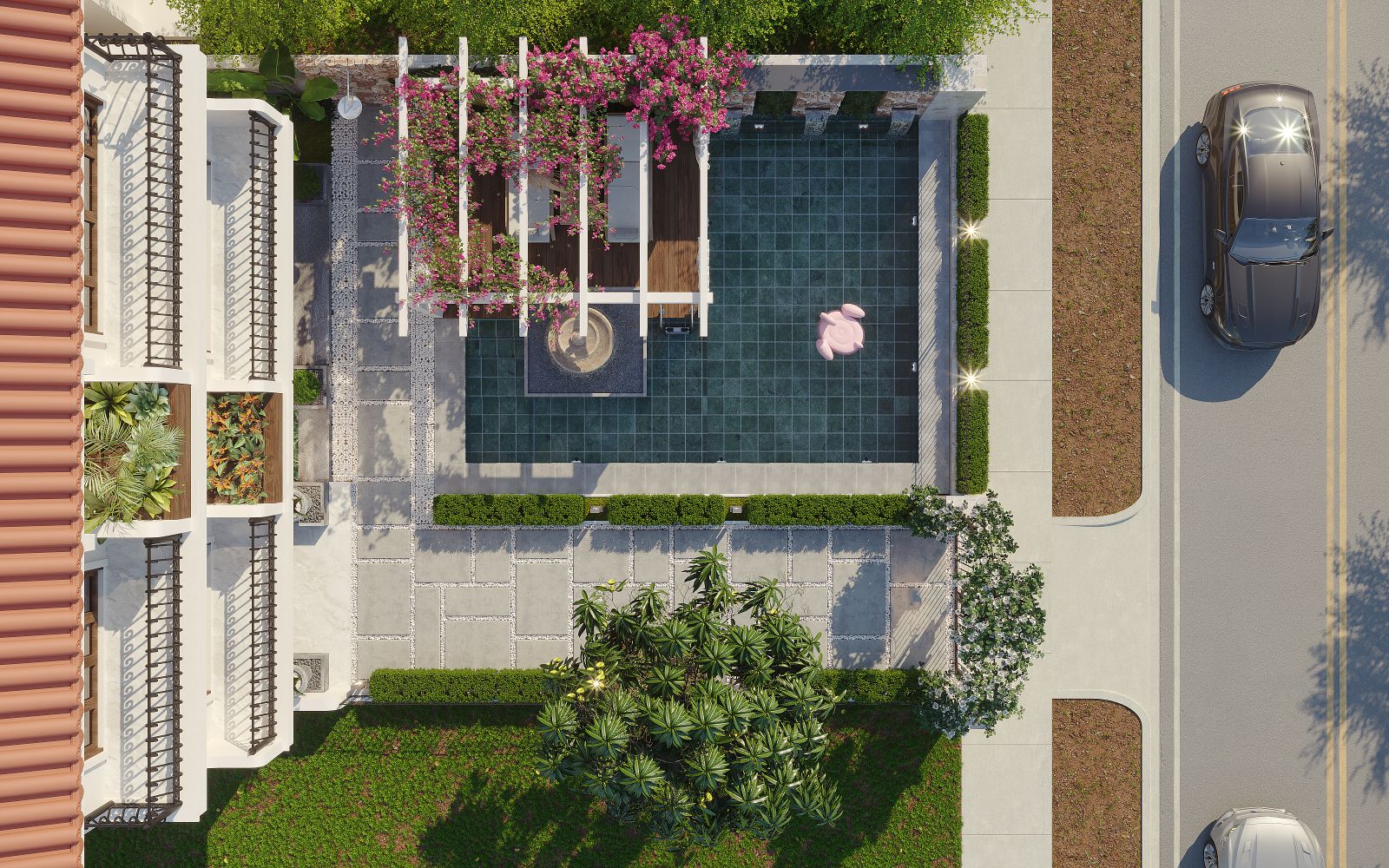 Bể nước và thảm xanh được đặt có chủ đích, mở ra góc nhìn thoáng đãng nhưng vẫn tạo sự riêng tư, đúng tinh thần của một villa nghỉ dưỡng cao cấp.