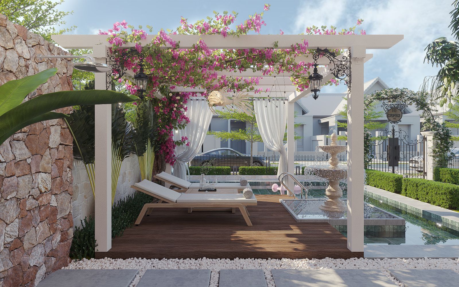 Điểm nhấn nổi bật là khu giàn pergola phủ hoa giấy hồng rực rỡ, vừa mang nét mềm mại, vừa tạo sắc thái lãng mạn đặc trưng của những khu nghỉ dưỡng miền biển. Không gian bên dưới pergola được bố trí khu thư giãn ngoài trời – nơi ánh nắng và gió biển được điều tiết vừa đủ qua các thanh lam trắng tinh tế.