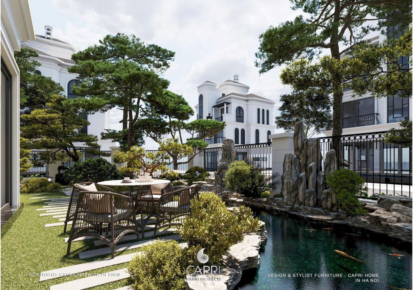 Hồ cá Koi được đặt ở vị trí trung tâm, đóng vai trò điều hòa năng lượng cho toàn bộ khuôn viên. Âm thanh nước chảy nhẹ nhàng, chuyển động uyển chuyển của đàn cá cùng sắc xanh của cây cỏ giúp không gian luôn tràn đầy sinh khí, mang lại cảm giác thư giãn mỗi khi trở về nhà.