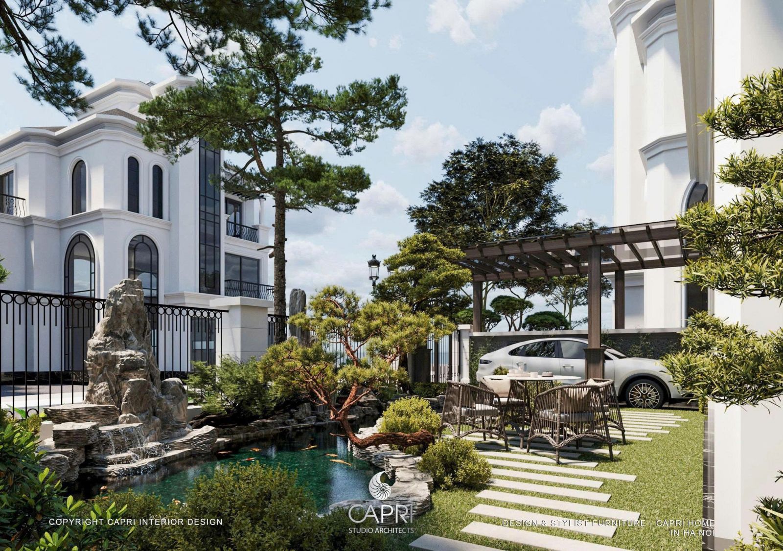 Cảnh quan sân vườn được Capri Studio Architects xem là một phần không thể tách rời của kiến trúc. Toàn bộ khu vườn được thiết kế theo triết lý Zen Garden, nơi con người tìm thấy sự cân bằng, thư thái và kết nối với thiên nhiên.