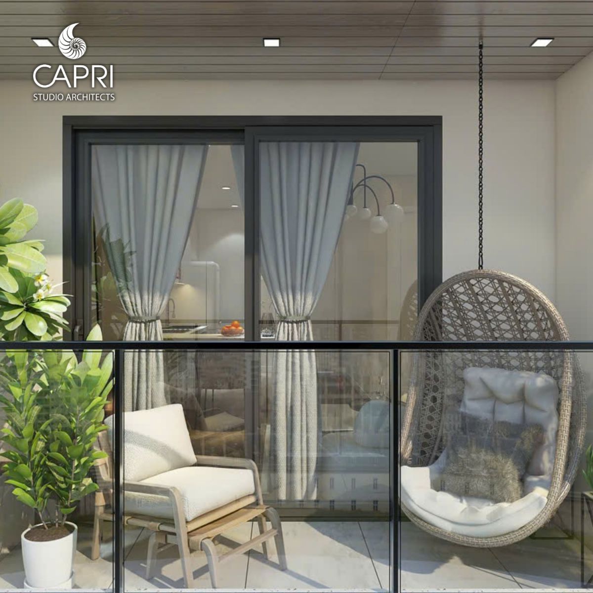 Ban công của căn hộ được thiết kế như một không gian nghỉ dưỡng thu nhỏ, kết nối trực tiếp với thiên nhiên và cảnh quan bên ngoài. Sàn và trần được ốp vật liệu mang lại cảm giác ấm áp, trong khi lan can kính cường lực giúp giữ trọn tầm nhìn thoáng đãng. Tâm điểm của khu vực này là ghế mây treo hình quả trứng với đệm êm ái – nơi lý tưởng để thư giãn, đọc sách hay tận hưởng không khí buổi sáng.